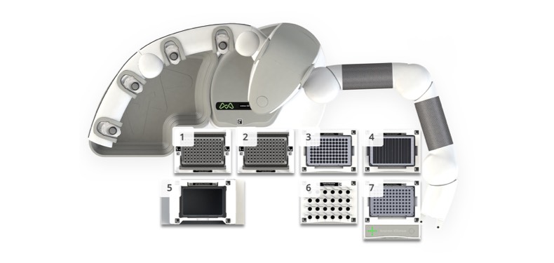 The QC GlycoWorks RFMS protocol (Figure 4) was validated by Waters on Andrew+. Experimental conditions and parameters were fine-tuned to fit the hardware configuration of the Andrew+ robot, i.e. labware Dominos and required, additional, connected devices (Figure 5), and produce reliable results, comparable to target scores and reproducibility among users. The Andrew+ robot can also greatly simplify the process of normalizing the concentrations of protein samples to meet the requirements of the GlycoWorks RFMS protocol.