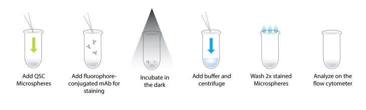 QuantumTM Simply Cellular® (QSC) microspheres (~ 6 - 9 μm in diameter) are used as external standards to measure the level of expression of receptors on cells. QSC Microspheres are labeled with the same fluorophore-conjugated monoclonal IgG antibody used to stain cells. QSC kits consist of a series of five microsphere populations: one uncoated blank and four coated with increasing amounts of Fc-specific capture antibody. Each kit is designed to specifically bind antibodies according to the host species from which they derive (e.g. QSC anti-Mouse IgG, QSC anti-human IgG, and QSC anti-rat IgG). For example, the QSC anti-Mouse kit is intended to bind mouse mAbs. Coated bead populations are calibrated in terms of their ABC for monoclonal antibodies and therefore, each population has a specific level of antibody capture capacity via the Fc portion of mAbs. In other words, each calibration bead population binds a specific, standardized number of antibodies, thus mimicking the binding of specific monoclonal antibodies to targets on the surface of cells. A titration step is essential to ensure that saturating amounts of labeled mAb are used to stain the beads and cells.