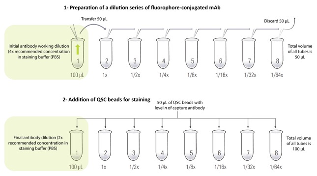 Figure 1: Sample setup scheme for the creation of a serial dilution of the fluorophore-conjugated mAb and staining of QSC beads. The aim is to perform an antibody titration and determine an optimal antibody concentration for the staining of QSC standards and cell samples.