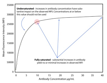 Accurate determination of cellular receptor density requires that each bead’s binding sites are fully saturated with the antibody. For this reason, an antibody titration step is crucial to determine the optimal antibody concentration required to reach saturation for staining. A general titration involves the creation of a dilution series of the fluorophore-conjugated mAb (Figure 1), typically using the manufacturer’s recommended concentration as a starting point and choosing a range of dilutions higher/lower than this value. A selected level of QSC beads is used and beads are stained with the different dilutions of fluorophore-conjugated mAb (Figure 1). Stained QSC beads are then analyzed by flow cytometry to determine each dilution’s mean fluorescence intensity and data are used to create a scatter plot displaying the mean fluorescence intensity versus antibody concentration (Figure 2). The determined optimal antibody concentration is finally used to stain all subsequent QSC bead populations (excluding the blank) in order to create a standard curve, as well as to stain cell samples.